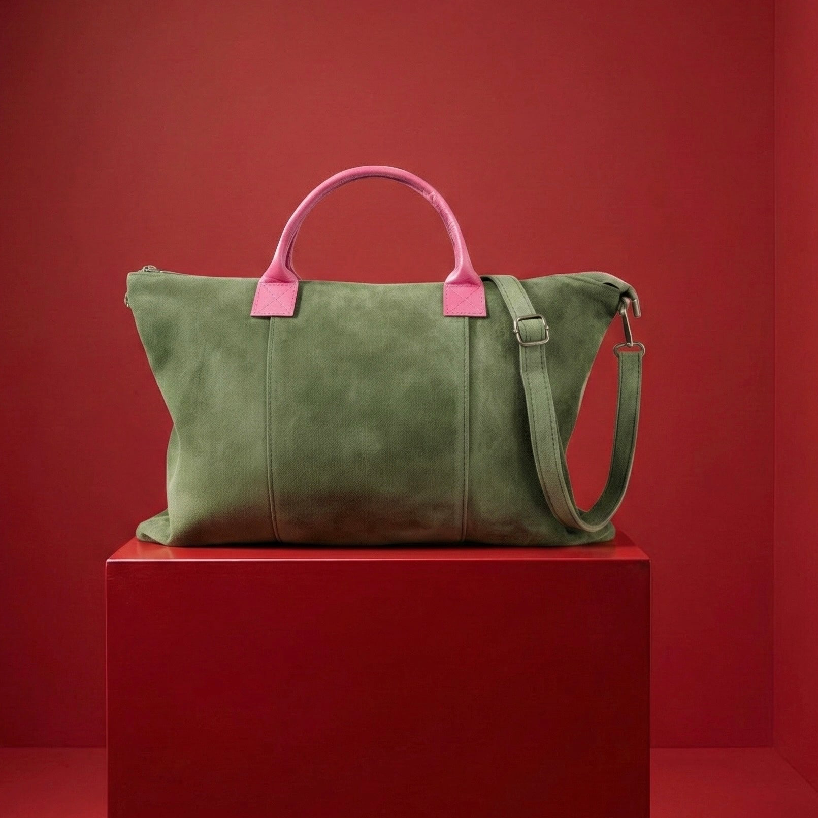 Milano Suede Bag, Olive, with Adjustable Shoulder Strap, Fuchsia & Green Leather Handles by Clemés