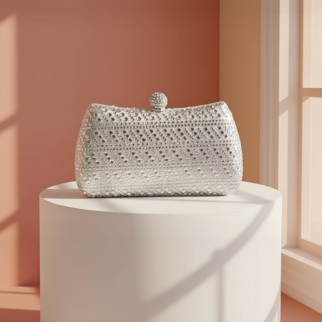 Meet Vittoria — a shimmering evening clutch designed to catch the light from every angle. Its luxurious silver-satin shell is generously encrusted with mixed-size, heat-sealed crystals for a textured, high-shine finish that recalls a starry night. Compact yet striking, it’s the perfect companion for weddings, black-tie galas, proms, or any night out when you want your accessories to make a statement.
