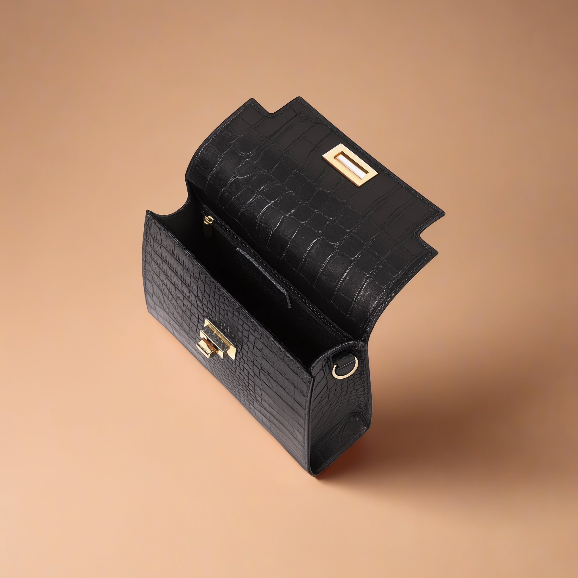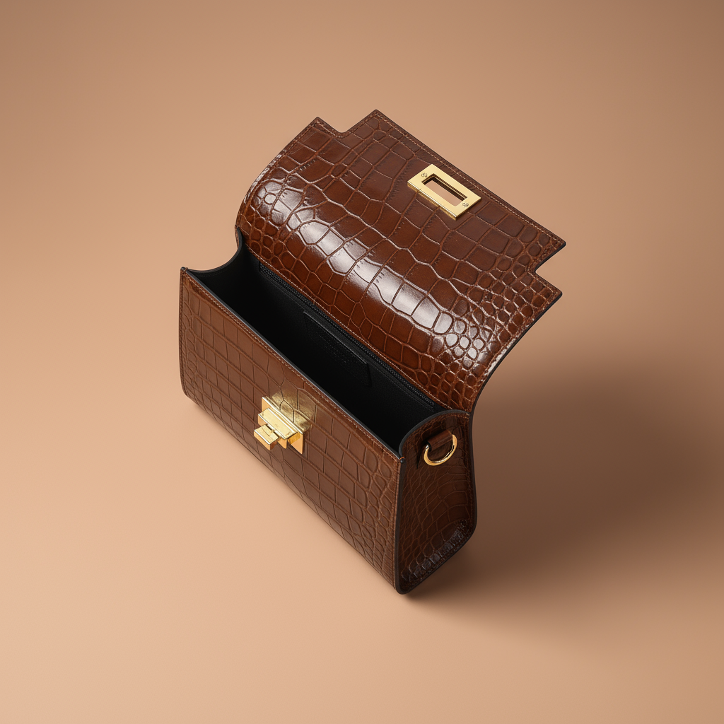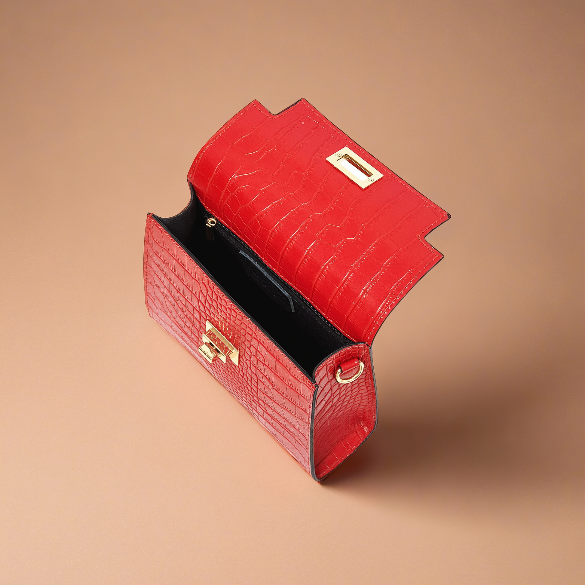 Handcrafted in Italy, this genuine leather crossbody bag showcases a glossy crocodile-embossed finish that brings instant polish to any outfit. A gold-tone turn-lock closure and hardware give it refined elegance, while the adjustable strap makes it versatile for day or evening wear. Compact in size yet practical, it features an interior zip pocket for secure storage of your essentials. Dimensions: 21 × 15.5 × 6 cm (8.3" × 6.1" × 2.4").