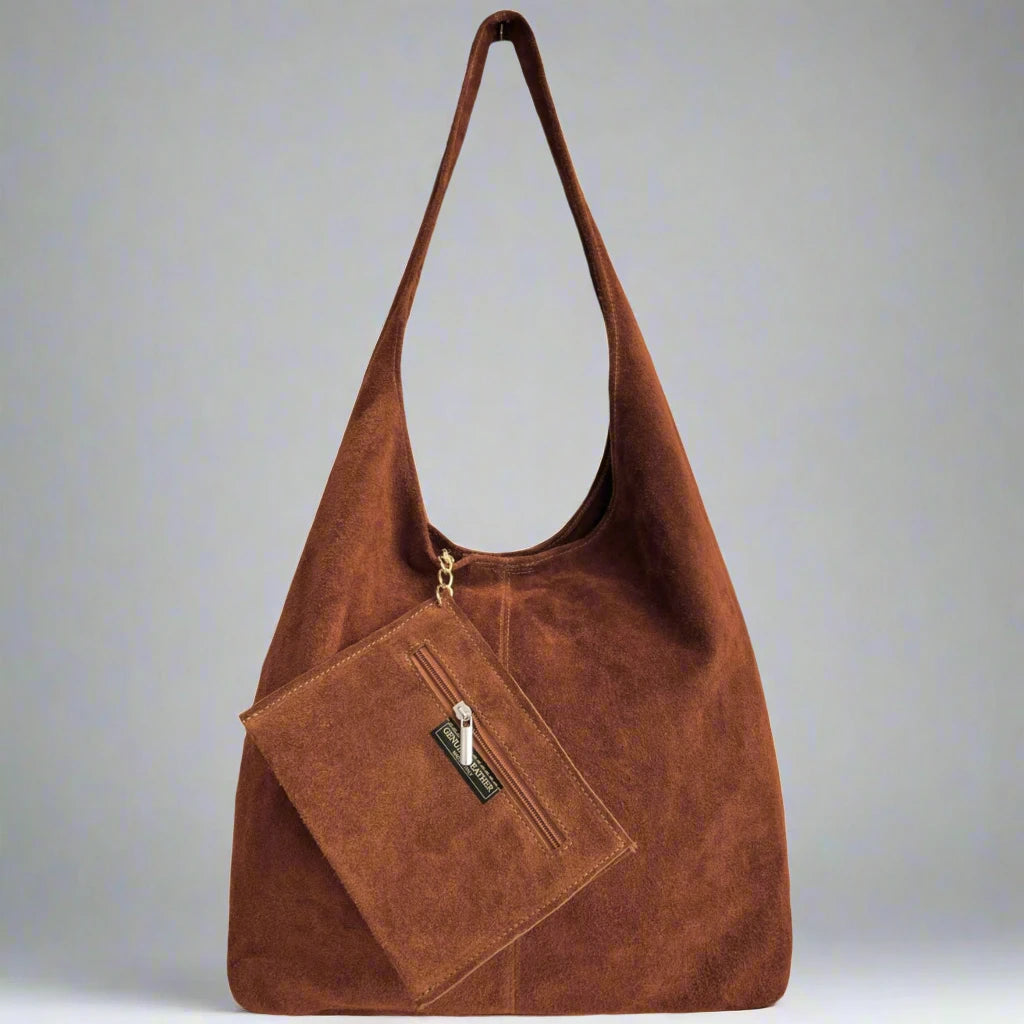 The Silvia Suede Bag is where understated elegance meets everyday ease. Handcrafted in Italy by our new sister brand Clemés from beautifully soft genuine suede leather, its relaxed silhouette is effortlessly chic yet highly practical. Designed with a secure top button closure, it keeps your belongings safe while maintaining its signature slouchy charm.